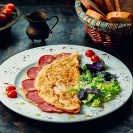 Омлет, фаршированный сырами креметте, сулугуни и ветчиной, в подаче с помидорами конкасе и сыром пармезан.