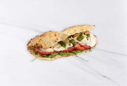 Запеченный панини со свежими томатами из теста на пиццу, с рукколой, страчателлой и песто из базилика.