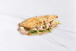 Запеченный панини с мортаделлой из теста на пиццу, с говяжьей мортаделлой, томатной сальсой, рукколой, домашней страчателлой и фисташкой.
