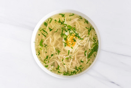 Суп на курином бульоне, с тонкой яичной лапшой, отварной курицей и яйцом 6ти минутка.