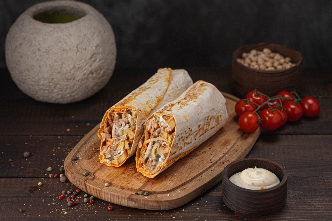 Тонкий лаваш,приправленный лазджаном, который придает изысканный и пикантный вкус блюду. Маринованное халяльное курицы и говядины, легкий ароматный белый соус, прекрасно дополняющий своим вкусом,и соленые огурцы, которые как нельзя кстати придутся по вкусу каждому.