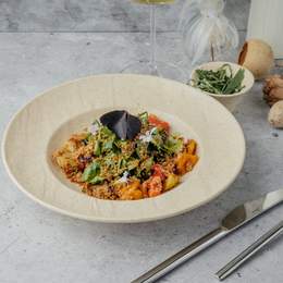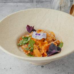 Сливочная паста с лёгкой остротой на выбор. Готовится на белом вине, с луком, чесночным маслом, сливками и перцем хлопьями. Подаётся с пастрами, кинзой, пармезаном и микрозеленью