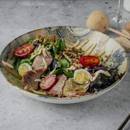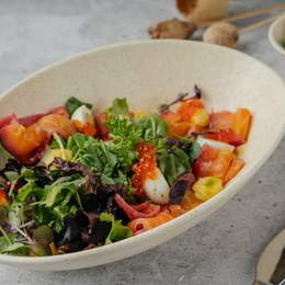 Микс салата с с пастрами, черри, яйцами, майонезом из сёмги. Украшается попкорном из гречки