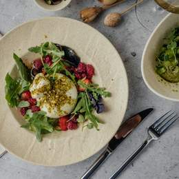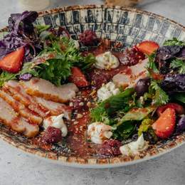 Микс салатов с утиным филе, свежими ягодами, кремом дор-блю и дроблёным фундуком