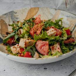 Тёплый салат с куриным филе, томатами, луком, соусом чили-мёд. Украшается кремом бальзамик и попкорном из киноа