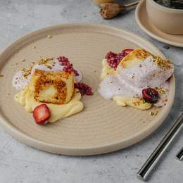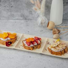 Домашний банановый хлеб, запечённый до золотистой корочки, подаётся с ягодным йогуртом и тремя начинками: бананом, персиком и клубникой. Украшается тёртыми орехами и микрозеленью