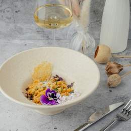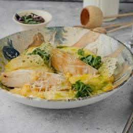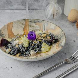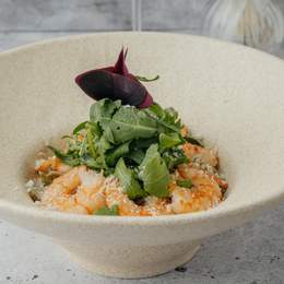 Паста на сливочной основе с луком, бульоном и чёрным перцем. Подаётся с обжаренными на топлёном масле креветками, пармезаном и шаром руколлы
