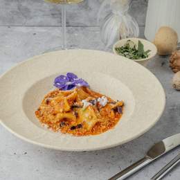 Домашние равиоли с начинкой из творожного сыра и зелени, подаются в лёгком томатном соусе с пряностями