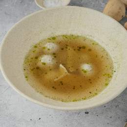 Лёгкий суп с куриными фрикадельками, равиоли с сыром и зеленью. Подаётся с перепелиными яйцами и хлебом