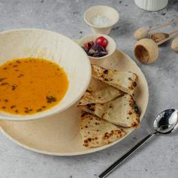 Говяжий бульон с зажаркой, капустой и картофелем. Подаётся с копчёным казы, пастрами, сметаной, луком и хлебом на гриле