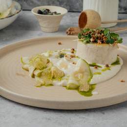 Судак в су-вид, с пюре из цветной капусты, цукини, щучьей икрой, зелёным маслом и гречневым попкорном