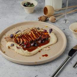 Грудка в су-вид, подаётся с пюре из сельдерея и вишнёвым демигласом