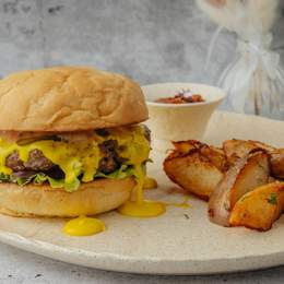 Сборка на булочке с котлетой, чеддером, крокетом, салатом, сальсой, томатами. Подаётся с дольками картофеля и соусом ладжан