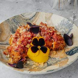 Куриное филе в панировке, обжаренное до хруста, запекается с томатным соусом на основе томатов, чеснока и пряных трав. Подаётся с моцареллой и пармезаном, расплавленными до золотистой корочки