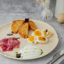 Картофельные драники с яйцами, сёмгой гравлакс, сметаной с зелёным маслом