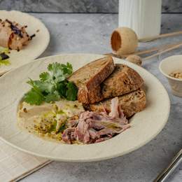 Хумус с тахини, лимоном и зирой, подаётся с пастрами, корнишонами, кинзой, фисташками, зелёным маслом и хлебом
