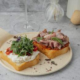 Две брускетты: одна с пастрами и сальсой, вторая — с страчателлой, рукколой, черри. Украшены бальзамиком и зелёным маслом