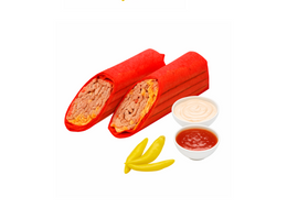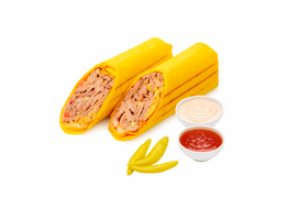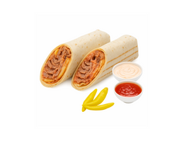 Пикантный лаваш, жареный картофель фри, свежие очищенные огурцы и помидоры. Начинка — ассорти из жареного куриного и говяжьего шампура. Дополняется белым слегка пекантным соусом и тремя острыми перчиками.