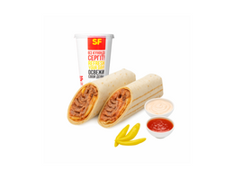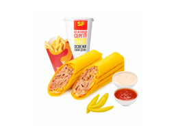 Пикантный лаваш, жареный картофель фри, свежие очищенные огурцы и помидоры. Начинка — сочный куриный шампур. Дополняется белым слегка пекантным соусом и тремя острыми перчиками.