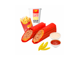 Пикантный лаваш, жареный картофель фри, свежие очищенные огурцы и помидоры. Начинка — сочный говяжий шампур. Дополняется белым слегка пекантным соусом и тремя острыми перчиками.