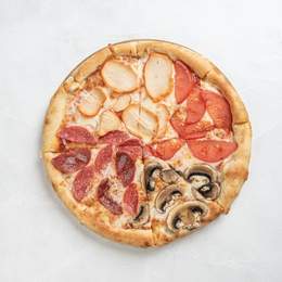 Курица , грибы , помидоры, колбаса , тесто , сыр мацарелло , томат размер 33см