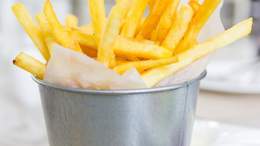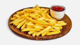 Цельные кусочки курицы на подушки из картофеля фри, фирменный соус, кукуруза.