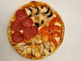 Соус, Моцарелла, тесто, томаты, колбаса Халал, грибы, куриное филе