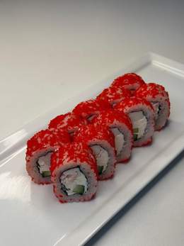 Ролл с нежным крабовый полочки и огурцом, обсыпанный икрой тобико для хрустящей текстуры.