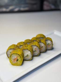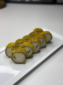 Ролл с жареным крабовый полочки и огурцом, обжаренный в хрустящей панировке.