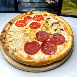 Тонкое тесто, томатный соус, сыр и четыре сектора с разными вкусами — грибы, колбаса , памидор и курица