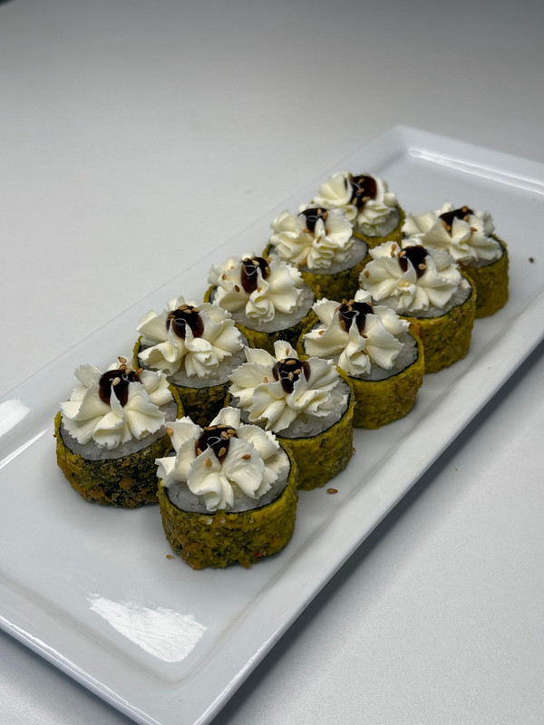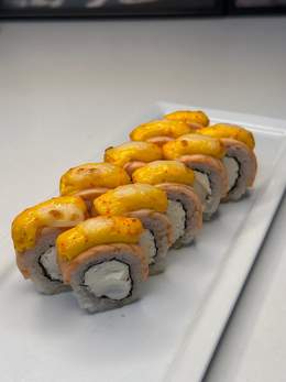 Ролл с угрём, сливочным сыром и нежным лососем, запечённый под сливочным соусом для насыщенного, тёплого вкуса.
