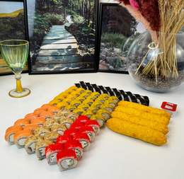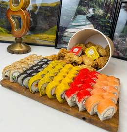 70 ролл + 6 шт нагетсы в подарок Филадельфия 10шт Калифорния 10шт Чиз ролл 10шт Сяке темпура 10шт Цезарь 10шт Кани жареный 10шт Каппа маки 10