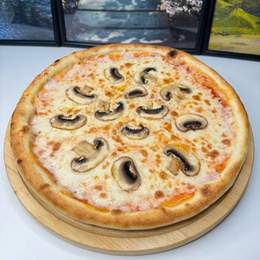 Тонкое тесто, сочные грибы, сыр и ароматный соус томатов.