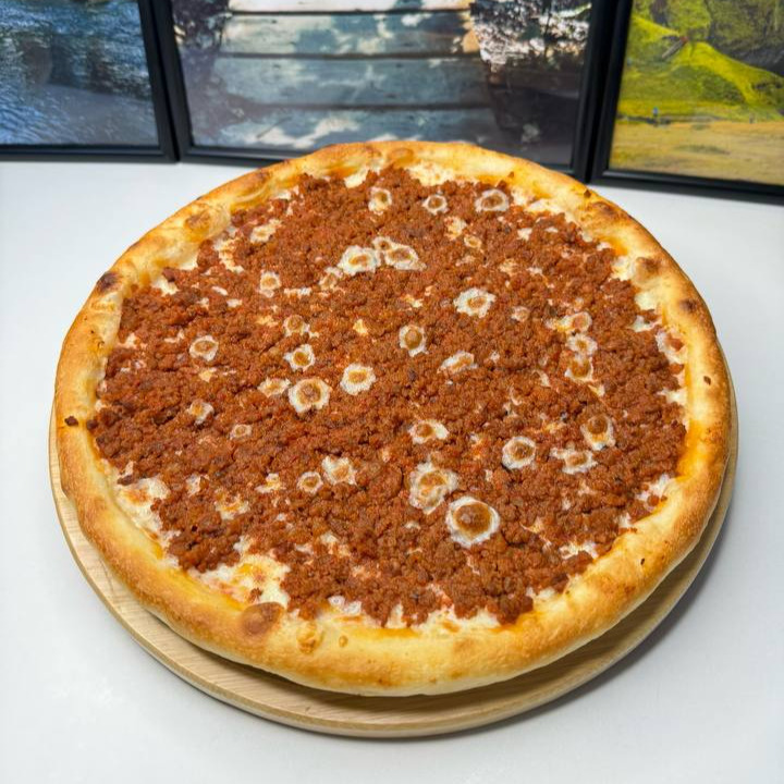 Тонкое тесто, соус Болоньезе с говядиной, томатами, ароматными специями и нежный сыр.