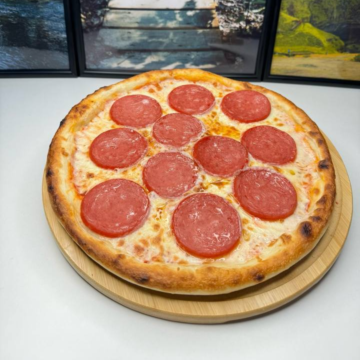 Тонкое тесто, томатный соус, сыр нежный и пикантные ломтики колбасы