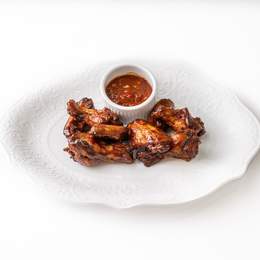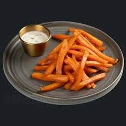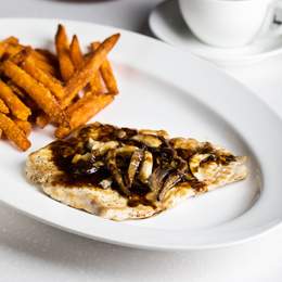 Отбивная из филе индейки с соусом жу и вешанками, подается с бататом фри