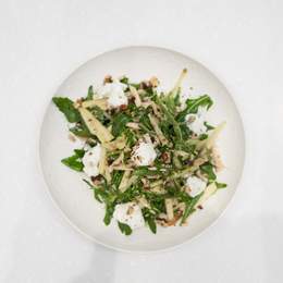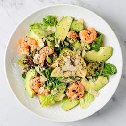 Листья салата ромейн ,авокадо ,яблоко ,сельдерей ,креветки , слайсы миндаля , азиатский соус (свитчили и травы )