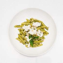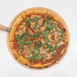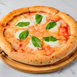 Наша фирменная пицца из цельнозерновой муки, с сыром моцарелла, томатным соусом, со страчателлой и свежим базиликом