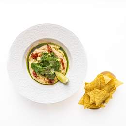 Хумус с авокадо и вялеными томатами (подается с хрустящей тартильей)