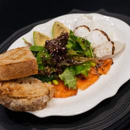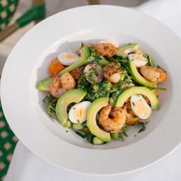 Жаренные тигровые креветки ,спелый авjкадо,перепелиные яйwа ,томаты черhи ,турецкие оливки ,эдемаме (бобы)подается с соусом из тунца .