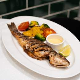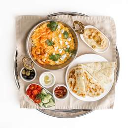 Яичница с суджуком (турецкой колбасой), питой, свежими овощами, турецкой фетой, маринованными оливками и маслинами, медом, юдзу джемом, апельсинами, сливочным маслом, соусом из виноградного сиропа и тахини (кунжутная паста). Подается с черным чаем.