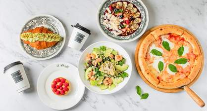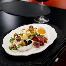 Скрембл из четырех яиц с фетой, креветками и лососем слабой соли. Подается с хумусом, копченным йогуртом, мариноваными оливками и маслинами, вялеными томатами, свежими огурцами и помидорами, двумя питами.