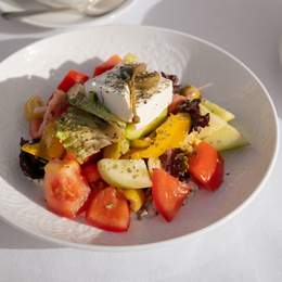 Салат из свежих овощей с добавлениям сыра фета, заправляется с соусом дзадзыки и украшается прованскими травами