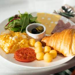 Скрембл осо сливочным сыром, круассан классический, сыр мааздам, говяжья ветчина, помидор, картофельные шарики и микс салата.