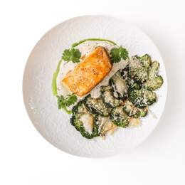 Стейк лосося с чипсами из брокколи с кокосовым соусом