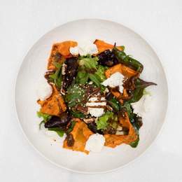 Томленые овощи с двумя яйцами пашот, хрустящим луком и фетой. Подается с питой.