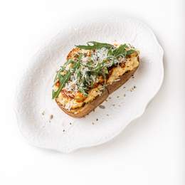 Скрембл тост с креветками в имбирном соусе с пармезаном