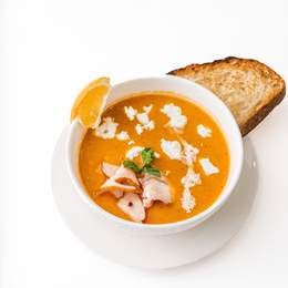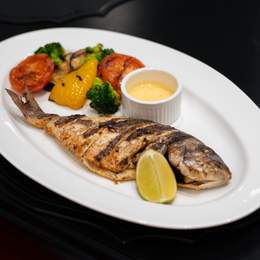 Стейк лосося обжаренный на хоспере, с соусом из кокоса и снежного краба с чипсами из брокколи