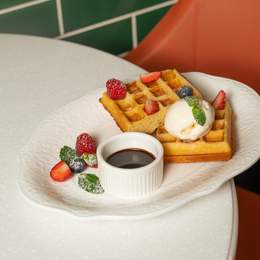 Две бельгийские вафли подаются с мороженым, свежими ягодами и шоколадным топпингом
