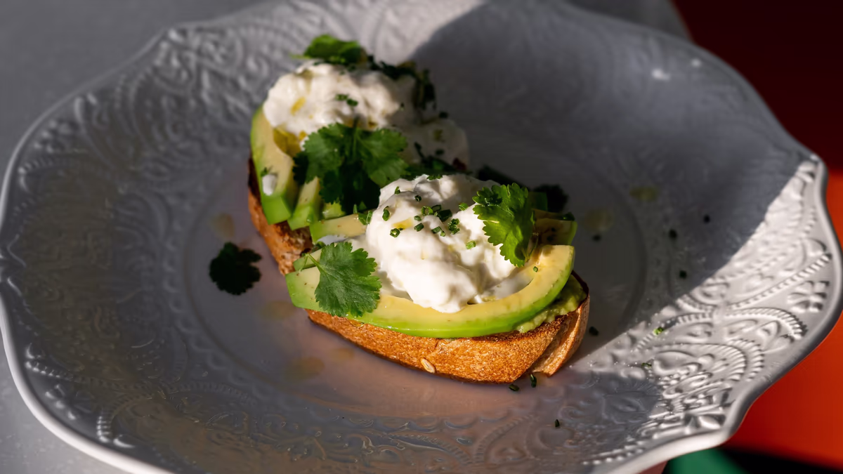 Ремесленный хлеб тартин с гуакамоле, дольками авокадо и сыром Страчаттела
